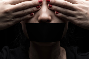 Woman taking off tape with censored word over mouth, democracy concept, freedom