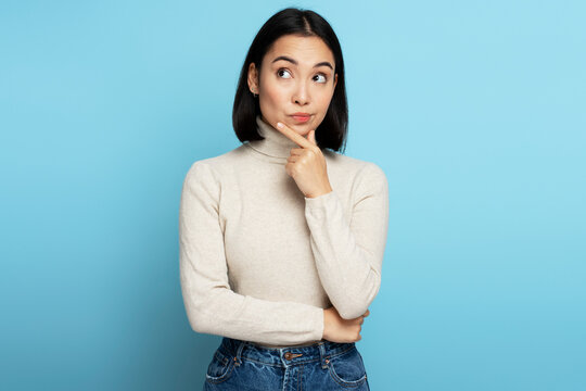 Pensive woman in green sweater looks uncertain or confused, touching chin and raising eyebrows.