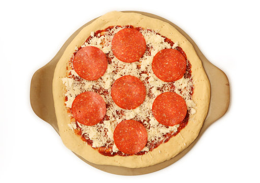 Uncooked salami pizza on metal paddle in front of wood oven.