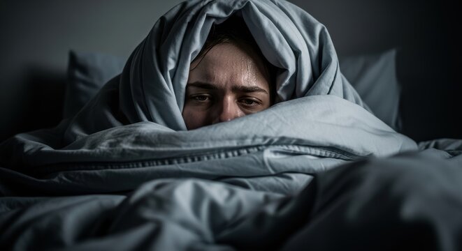 Woman sleeping peacefully in bed under white duvet cover for relaxation and wellness concept photography