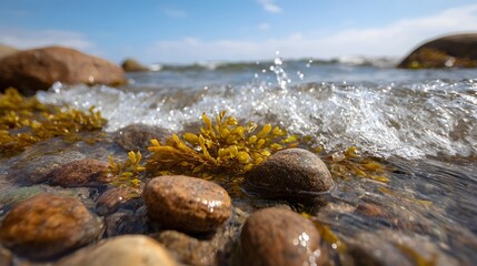 Close up of wet stones and golden seaweed on a rocky shore as a gentle wave washes over under a bright blue sky