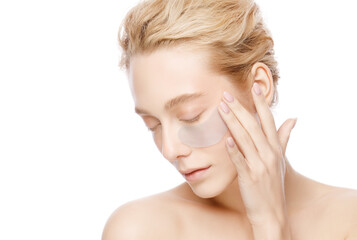 Beautiful woman holding collagen eye patch with one hand, isolated on white background. Perfect clean fresh skin care treatment or cosmetic ads