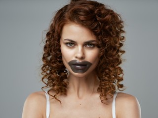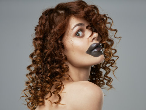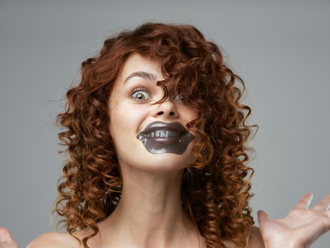 Beautiful young female with surprised look, holds chin with both hands, keeps lips rounded, wears undereye patches, stands shirtless, has rejuvenation treatment, cares about skin, isolated on pink