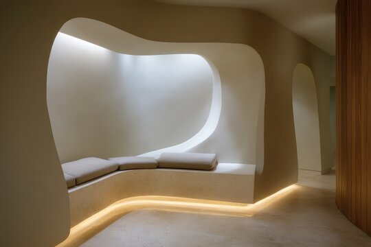 Bed pod built into wall alcove with soft beige lighting and underframe shadow pooling, organic curves casting controlled ambient