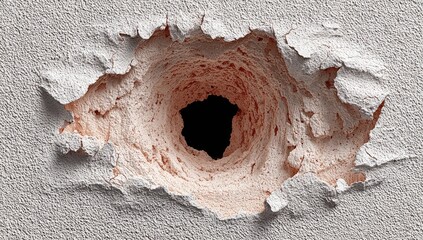 Close-up of a roughly circular hole in a light-grey textured wall, showing exposed, peach-toned underlayer and ragged edges.  The hole's interior is dark and appears deep