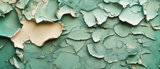 Peeling paint texture in shades of blue and green with a beige underlayer providing copy space for text