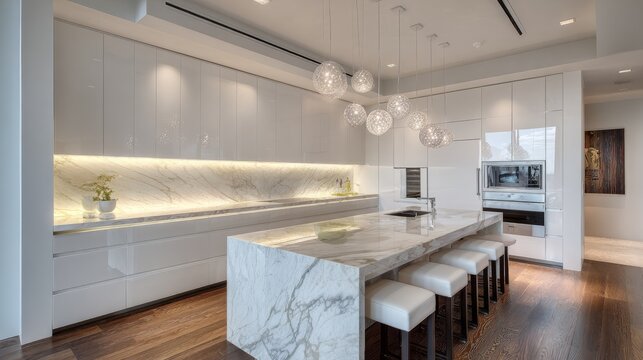 Minimalist modern kitchen, glossy white cabinetry, underlit marble backsplash, pendant lighting over textured kitchen island