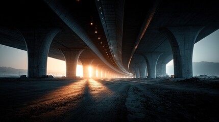 Underneath Highway Overpass with Sunlight and Shadows Creating a Dramatic Urban Scene : Generative AI