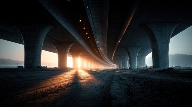 Dramatic Architecture Underneath Elevated Highway Infrastructure at Sunset
