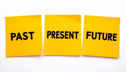 Sticky notes labeled PAST, PRESENT, FUTURE on white.