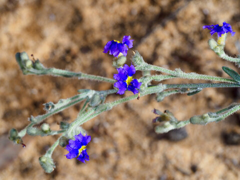 The flower of the sparsely branched perennial undershrub found in the Australian Mallee known as Grooved Dampiera (Dampiera lanceolata).