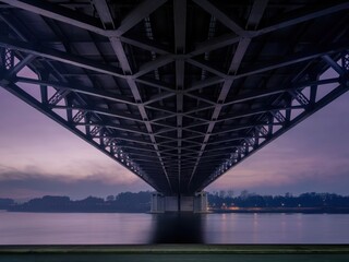 Symmetrical view of the underside of a massive steel bridge at twilight, featuring intricate crisscross beams, a reflective water surface, soft purple hues, and faint city lights in the background
