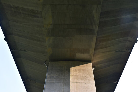 A minimalist view looking up at the underside of a modern concrete bridge or structure with clean lines and geometric shapes.