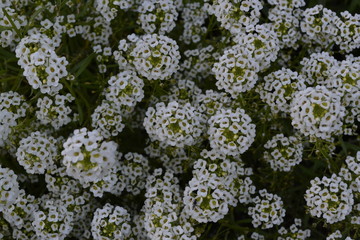 Red and yellow primrose in the garden against a background of white undersized flowers. Spring concept, beautiful flowers in the flowerbed