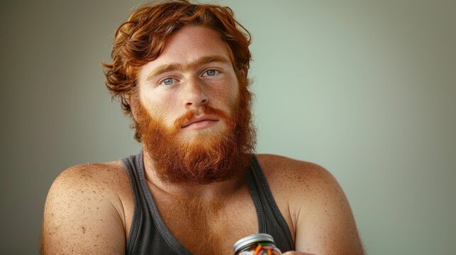 Purposeful persistent motivated stout guy has regular workout at gym, wears hairband, undersized vest and towel around neck, has big abdomen with tattoo, points thumb on blank space for your text