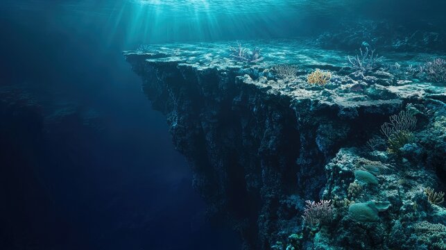 Sunbeams pierce deep blue ocean water illuminating underwater canyon walls. Aquatic landscape shows serene rocky cliffs submerged beneath clear sea surface.