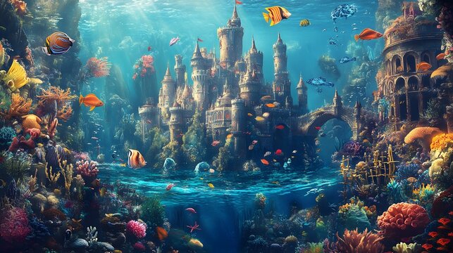 Beautiful underwater scene with many different types of fish and coral. The colors are vibrant and the sunlight is shining through the water, creating a peaceful and serene atmosphere
