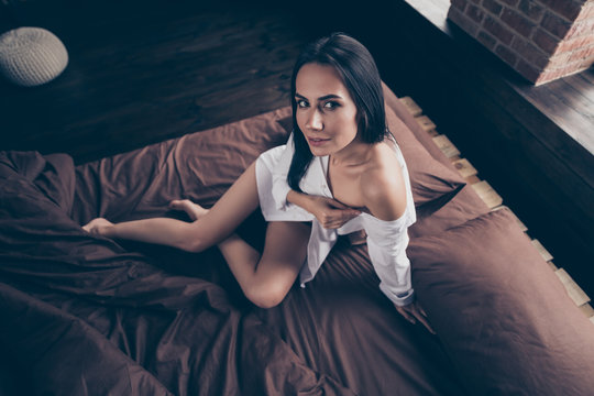Above high angle view of her she nice-looking attractive lovely lovable pretty nude girl sitting on bed bare foot teasing undressing at industrial brick wood loft modern interior style flat house
