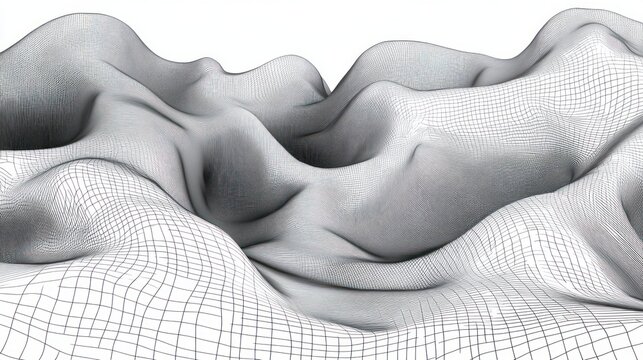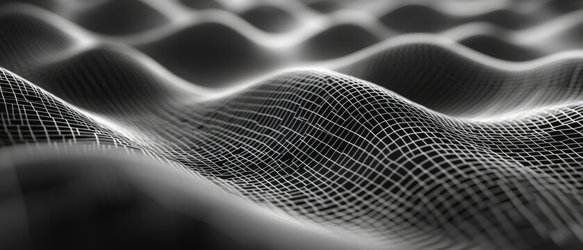 Flowing luminous mesh wave undulating across digital data field, with glowing nodes and mesh grid