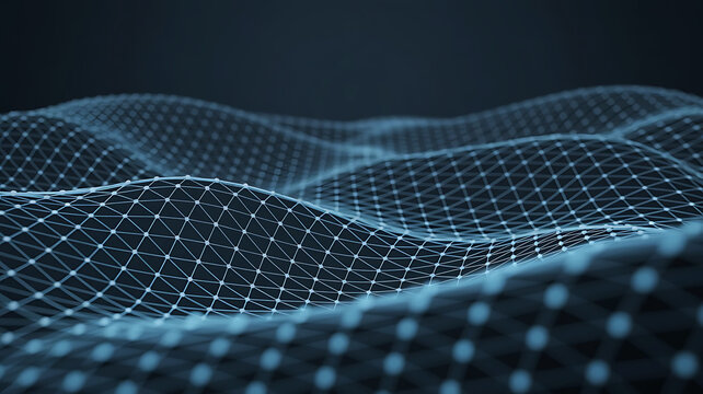 Flowing luminous mesh wave undulating across digital data field, with glowing nodes and mesh grid