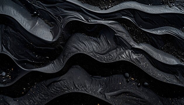 An abstract close-up of dark, undulating textures resembling flowing matter, possibly sand or earth. Granular details and subtle highlights