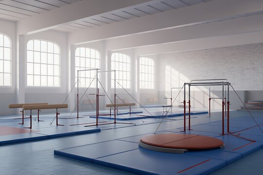 Inspiring gymnastics training hall with balance beam and uneven bars bathed in bright daylight for fitness, strength, and athletic achievement advertising