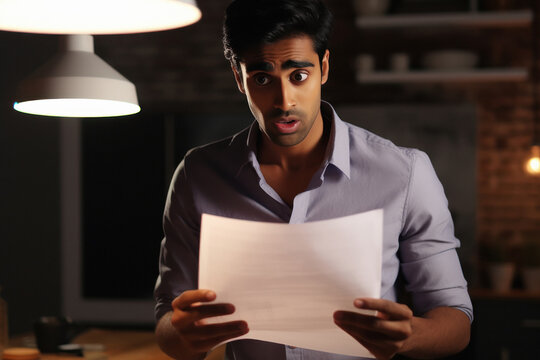 Diverse couple reacting to surprising mail while sitting on couch in open-plan kitchen