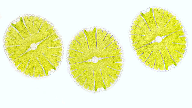 Microscopic view of green algae. Algae show intricate patterns, shapes. Laboratory setting. Possible unicellular organisms. Study of eco systems, biology. Perfect for botany research biology