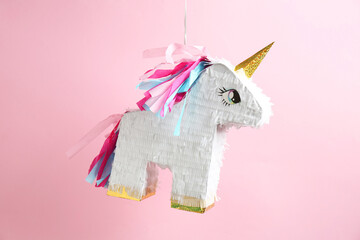 Traditional Mexican unicorn pinata on a vibrant pink background