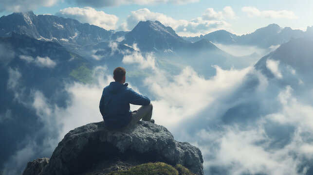 Man embracing tranquility in dreamlike pastel cloud backdrop