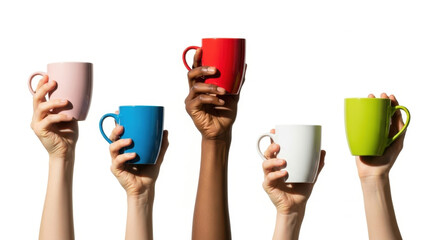 Raised Up Hands Holding Colorful Ceramic Mugs In Air Isolated On White Background Diverse Group Celebration Support Teamwork