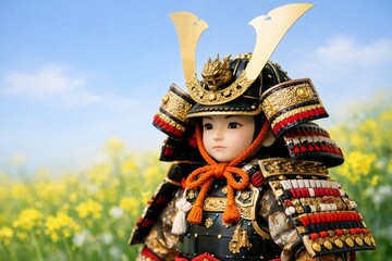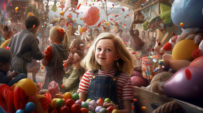 Childrens Day. A girl stands in front of a crowd of easter eggs.