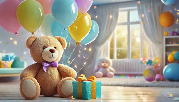 Miś, balony i prezent w dziecięcym pokoju. Tło urodzinowe lub na dzień dziecka.