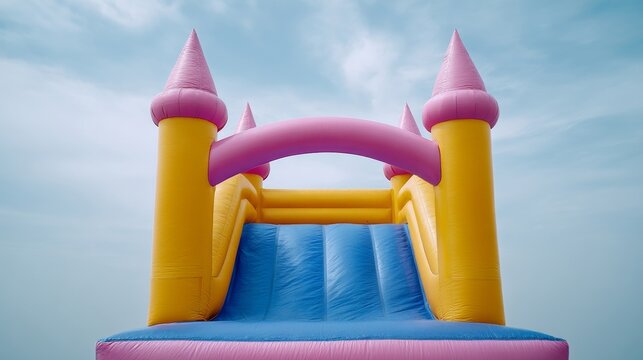 Colorful inflatable castle under whimsical skies, perfect for childrens day celebrations, fantasy escapades, and vibrant joy fests