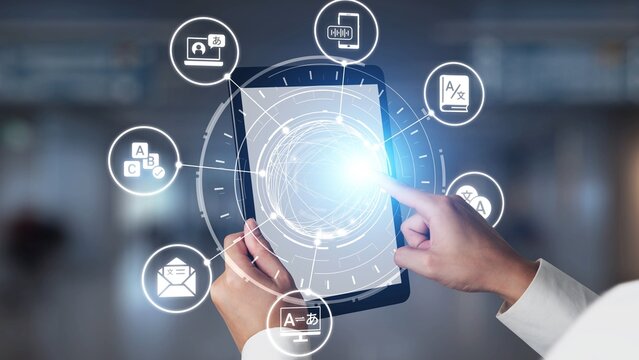 Translation icons show international languages, interpretation, and communication. Translation helps global business, translation supports learning, and translation improves cultural exchange. Gist