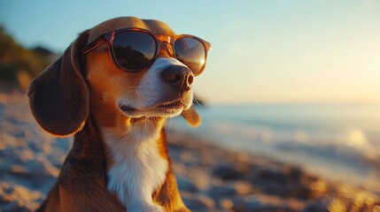 Close up portrait of a beagle dog wearing stylish sunglasses against a minimalist white backdrop capturing a summer holiday mood that is perfect for versatile image usage worldwide