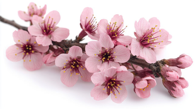 A delicate branch of pale pink cherry blossoms with unopened buds rests on a stark white background showcasing sptime beauty and gentle floral details.