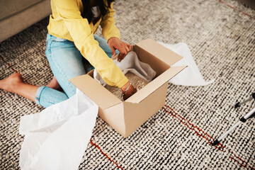 Mid adult woman unpack box with clothes. Online shopping concept
