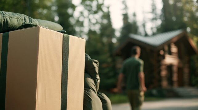 Cabin Move-in Cardboard Box and Green Sleeping Bag, Outdoors , Cabin life