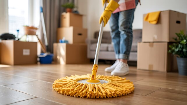 Person wearing yellow gloves and jeans cleans wooden floor with a yellow mop surrounded by moving boxes in a sunlit room