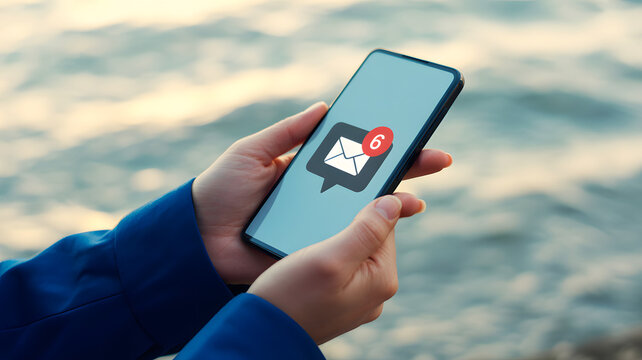 Person using a smartphone with notification icons showing message and bell alerts on the screen