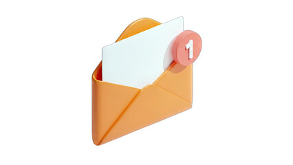 Orange Open Envelope with Blank White Paper and Red Notification Icon Showing Number One on Transparent Background