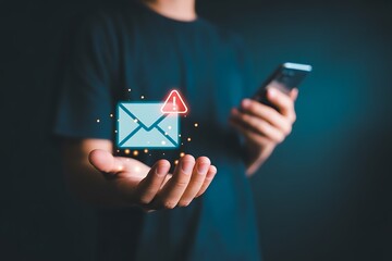 Man Holds Smartphone with Overlaid Email Icons and Notification Alert, Representing Spam or Unread Messages