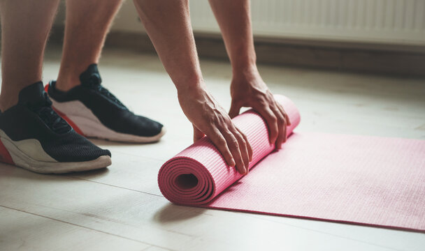 Side view photo of a caucasian person in sportswear finishing his yoga procedure and gathering the carpet