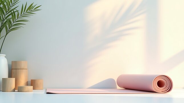 Sunlit yoga mat duo standing in minimalist studio corner with woven planter and greenery
