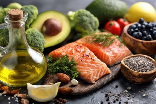 Healthy sources of unsaturated fat and omega 3 include fresh raw salmon avocado olives nuts Good for nutrition and keto diet Space for text