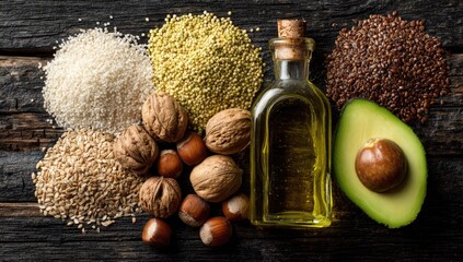 Oils ingredients seeds, nuts, avocado, bottle, wooden plank