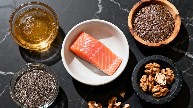 Omega 3 Superfoods with Salmon, Chia Seeds, Flax Seeds and Walnuts in Elegant Bowls