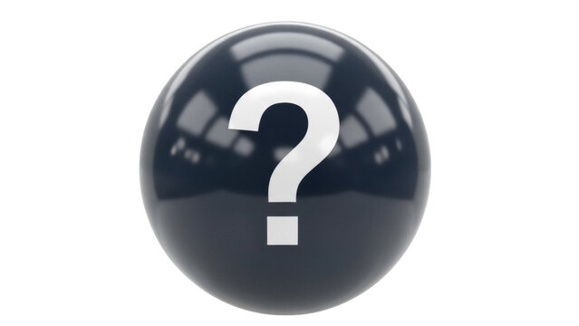 Shiny dark blue sphere with question mark isolated PNG, glossy ball with reflection on transparent background, uncertainty and mystery concept