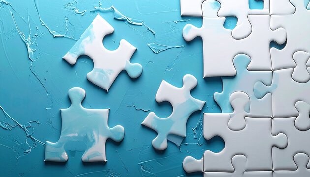 Teal textured background with partially completed white jigsaw puzzle; some pieces are separated, showing light blue marbling